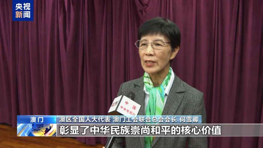 澳区全国人大代表 澳门工会联合总会会长 何雪卿:习近平主席的重要讲话深刻阐释了伟大抗战精神的内涵,彰显了中华民族崇尚和平的核心价值,体现了中国式现代化坚持走和平发展道路的坚定信心,进一步增强了居民对国家与民族的自豪感和荣誉感。我们将传承伟大的抗战精神。