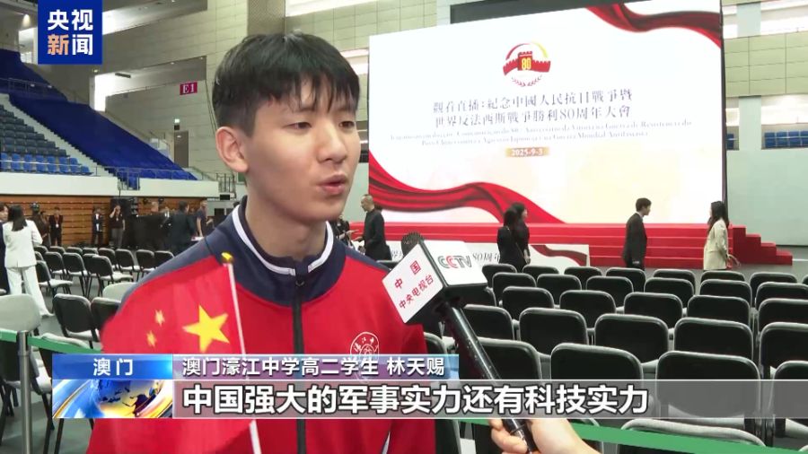澳门濠江中学高二学生 林天赐:看完了今天这场盛大的阅兵仪式,也是让我看到了中国强大的军事实力还有科技实力,这也让我倍感自豪。