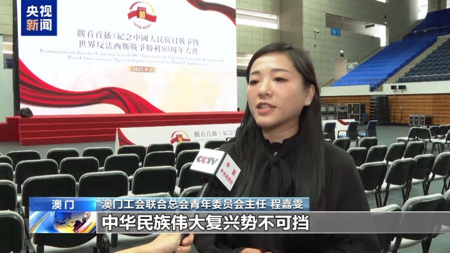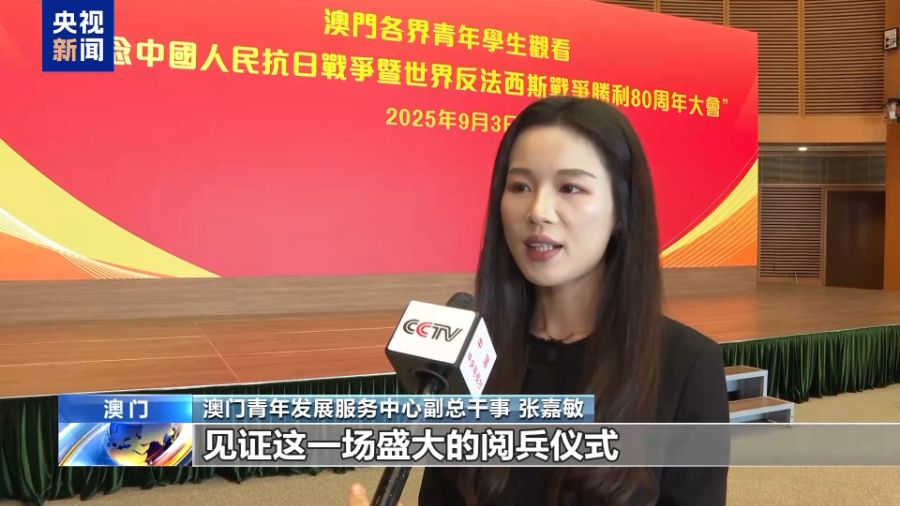 澳门青年发展服务中心副总干事 张嘉敏:今天能够通过直播见证这一场盛大的阅兵仪式,我的心情是非常激动的。习主席在讲话当中也提到要传承和弘扬伟大抗战精神,踔厉奋发、勇毅前行。对于我们澳门青年来说,就是要传承红色基因,更要敢于创新、勇于探索还有突破,把握住国家发展的机遇。