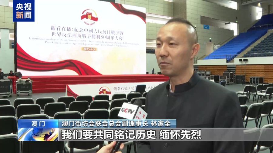 澳门街坊会联合总会副理事长 林家全:习主席提到,我们要共同铭记历史、缅怀先烈、珍爱和平、开创未来。我们作为新时代的澳门青年,要弘扬以爱国主义为核心的伟大民族精神,团结奋斗,为实现中华民族伟大复兴贡献自己的力量。