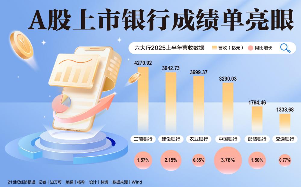 2025年上半年,A股上市银行营收合计2.92万亿元,同比增长1%;归母净利润1.1万亿元,同比增长0.8%。国有大行继续保持行业支柱地位,六大行合计贡献营业收入1.83万亿元,实现净利润6825.24亿元,在整体市场中的占比均超过六成。