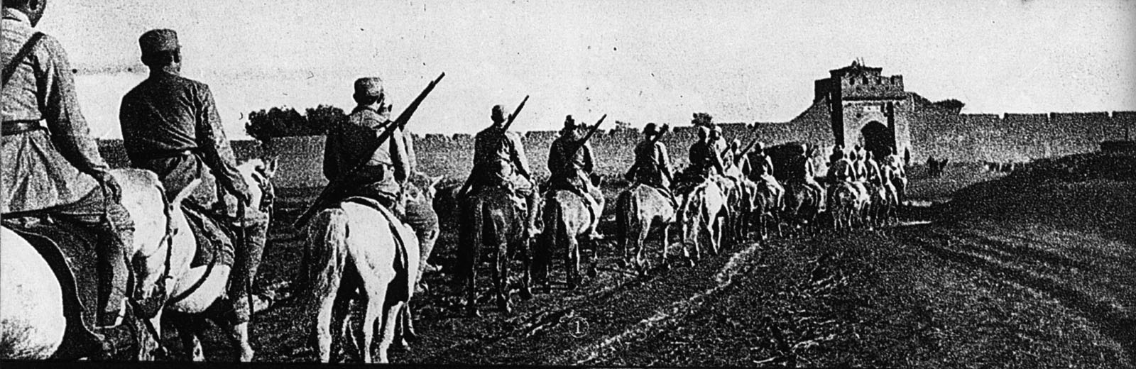 1945年8月,中国抗日武装力量向日军发起全面反攻。图为八路军晋绥部队解放兴和城,骑兵部队列队进城。新华社发