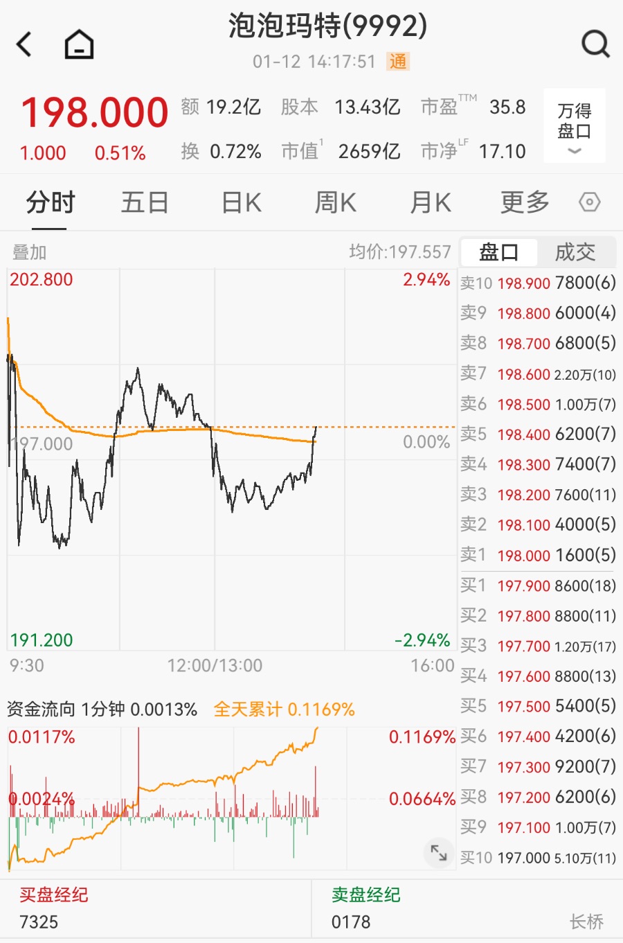 截至1月12日14:17,泡泡玛特股价报198港元/股,涨0.51%,总市值为2659亿港元。