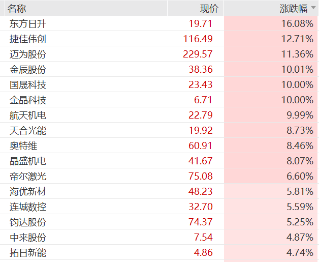 光伏概念活跃,钙钛矿电池、太空光伏方向领涨,东方日升、迈为股份、捷佳伟创涨幅居前,此前杭萧钢构、金晶科技涨停,国晟科技触及涨停,天合光能、金辰股份等跟涨。