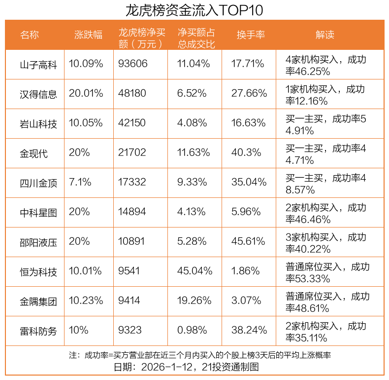 1月12日,上证指数上涨1.09%,深证成指上涨1.75%,创业板指上涨1.82%。盘后龙虎榜数据显示,共有63只个股因当日异动登上龙虎榜,资金净流入最多的是山子高科(000981.SZ),达9.36亿元。