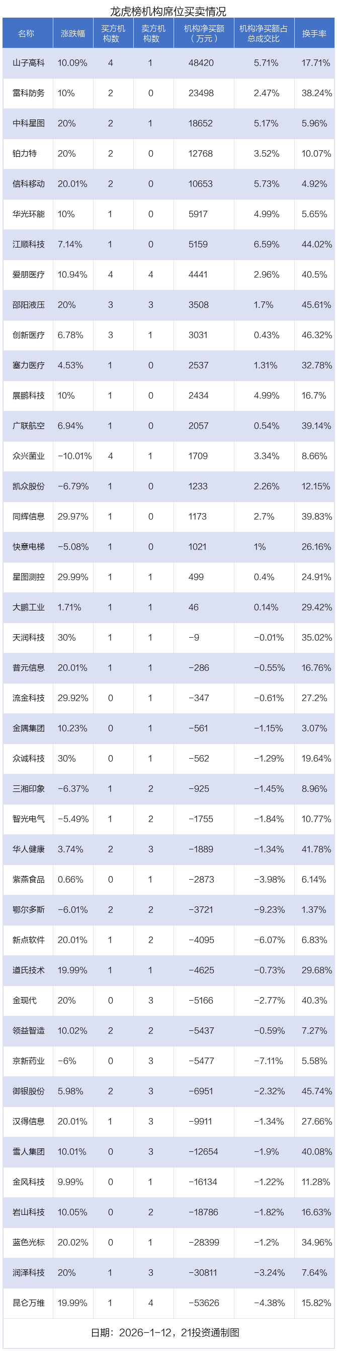 1月12日,42只个股龙虎榜出现了机构的身影,机构合计净卖出6.62亿元。具体来看,机构净买入19股,净卖出23股。