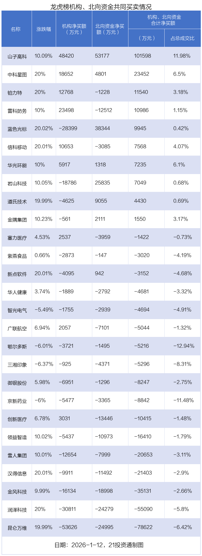 值得注意的是,机构和北向资金共同净买入了山子高科、中科星图、华光环能等3股;共同净卖出了紫燕食品、御银股份、鄂尔多斯、华人健康、智光电气、京新药业、三湘印象、雪人集团、领益智造、汉得信息、金风科技、润泽科技、昆仑万维等13股;在蓝色光标,岩山科技,道氏技术,金隅集团,新点软件,铂力特,信科移动,塞力医疗,广联航空,雷科防务,创新医疗上出现分歧,机构净卖出蓝色光标2.84亿元,北向资金净买入3.83亿元;机构净卖出岩山科技1.88亿元,北向资金净买入2.58亿元;机构净卖出道氏技术4624.99万元,北向资金净买入9055.27万元;机构净卖出金隅集团561.08万元,北向资金净买入2111.29万元;机构净卖出新点软件4094.59万元,北向资金净买入942.14万元;机构净买入铂力特1.28亿元,北向资金净卖出1228.26万元;机构净买入信科移动1.07亿元,北向资金净卖出3085.04万元;机构净买入塞力医疗2536.87万元,北向资金净卖出3958.78万元;机构净买入广联航空2057.03万元,北向资金净卖出7101.02万元;机构净买入雷科防务2.35亿元,北向资金净卖出1.25亿元;机构净买入创新医疗3031.17万元,北向资金净卖出1.34亿元。