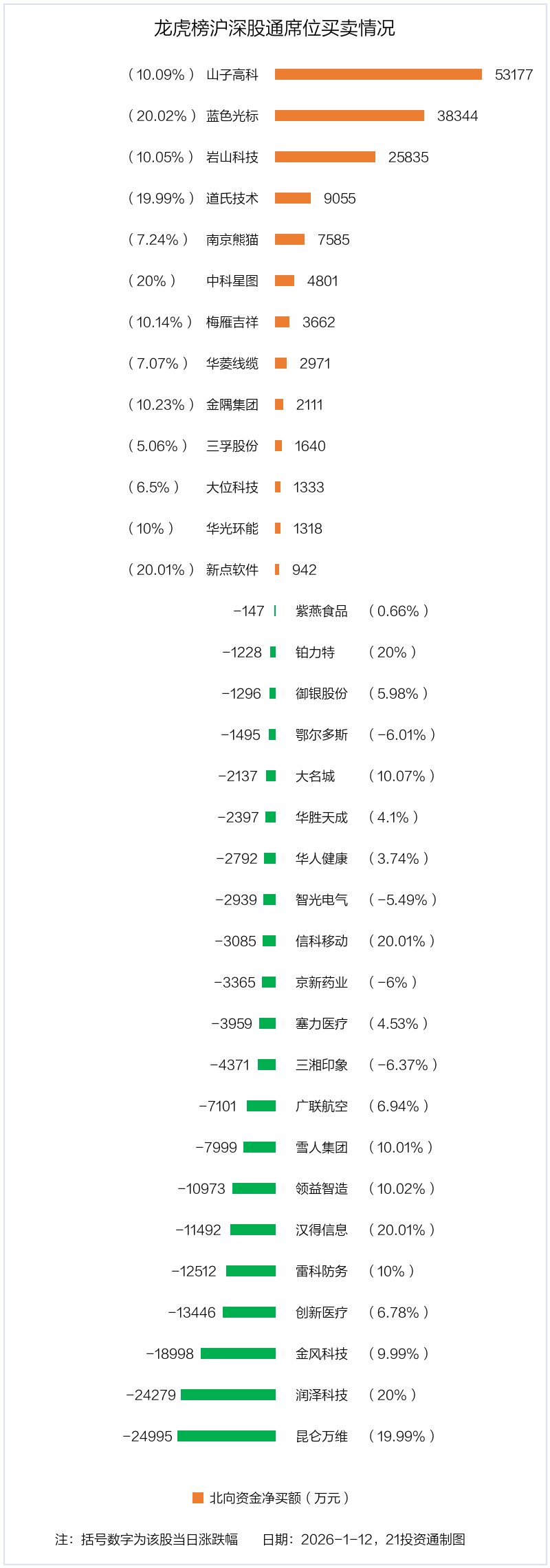 1月12日,北向资金参与龙虎榜中的个股共有34只,合计净卖出8232.25万元。其中沪股通净买入8 股,净卖出7 股,合计净买入8943.98万元;深股通净买入5 股,净卖出14 股,合计净卖出1.72亿元。