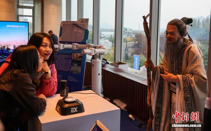 2025年10月17日,2025沈阳机器人大会在辽宁沈阳开幕。图为观众与交互型仿生人形机器人孔子互动。中新社记者 于海洋 摄