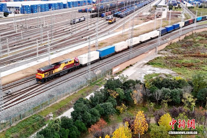2025年11月17日,X9043次中欧班列从位于陕西西安的西安国际港站发出。中新社记者 张远 摄