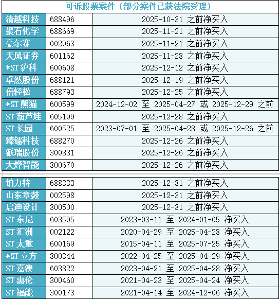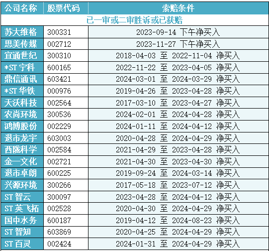 结合相关法律法规及近年案例,经分析,目前有思美传媒(002712)、*ST华铁(000976)、天风证券(601162)、ST福能(300173)、卓然股份(688121)、倍轻松(688793)、铂力特(688333)、ST长园(600525)、山东章鼓(002598)、启迪设计(300500)、ST得润(002055)、海南华铁(603300)等多只股票或可索赔,本文整理了胜诉及部分近期或涉信披违规被立案调查或财务造假被处罚的股票的初步索赔条件,共计约五十只股票,供投资者参考(最终索赔条件或是否胜诉须以法院认定为准),其余或可索赔的股票将陆续发布,敬请关注。