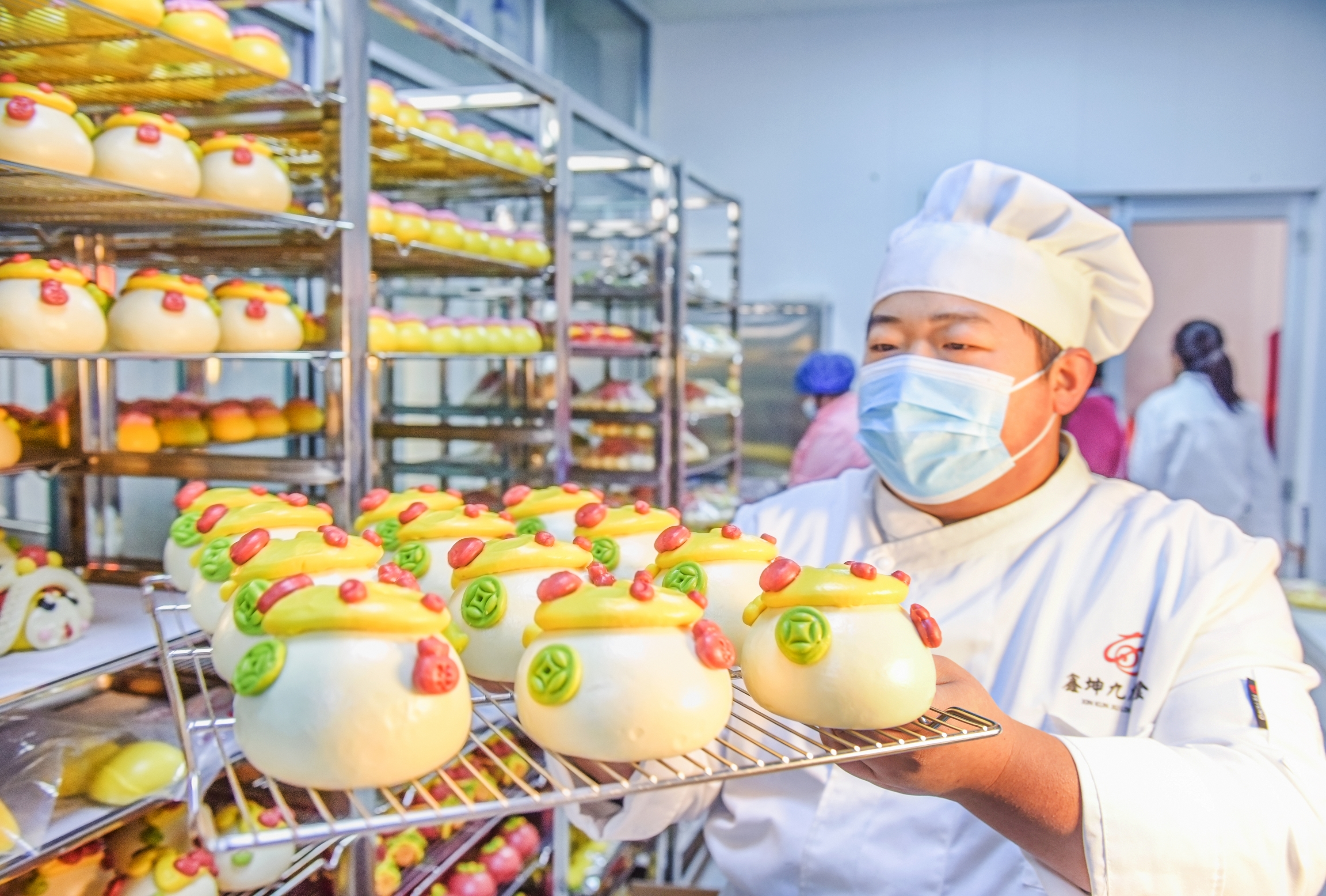 ↑1月13日,工人在河北省遵化市娘娘庄镇一家面食加工厂包制黏饽饽。新华社发(刘满仓摄)