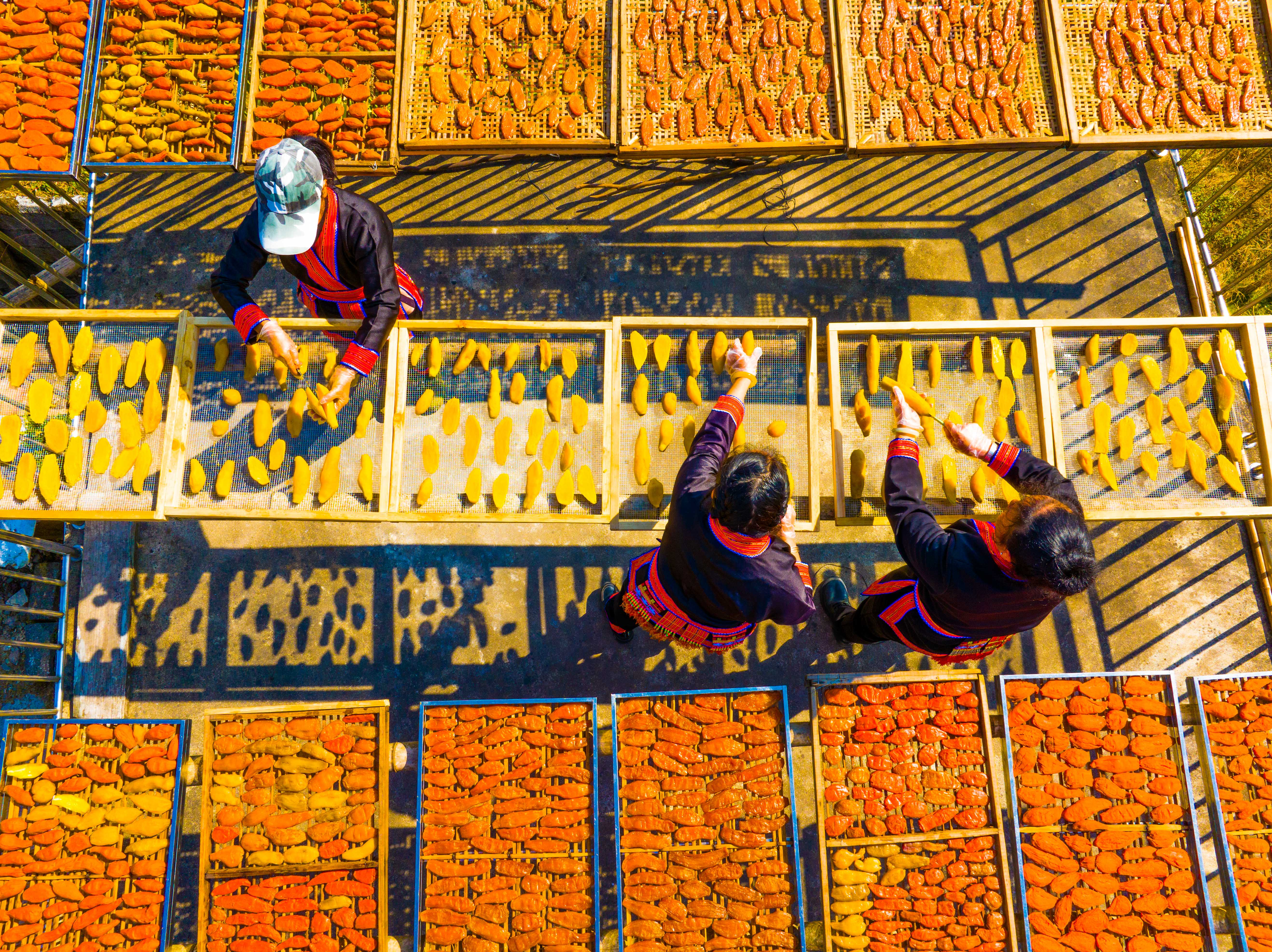 ↑1月12日,广西金秀瑶族自治县忠良乡巴勒村村民在院落里晾晒红薯干(无人机照片)。新华社发(高如金摄)