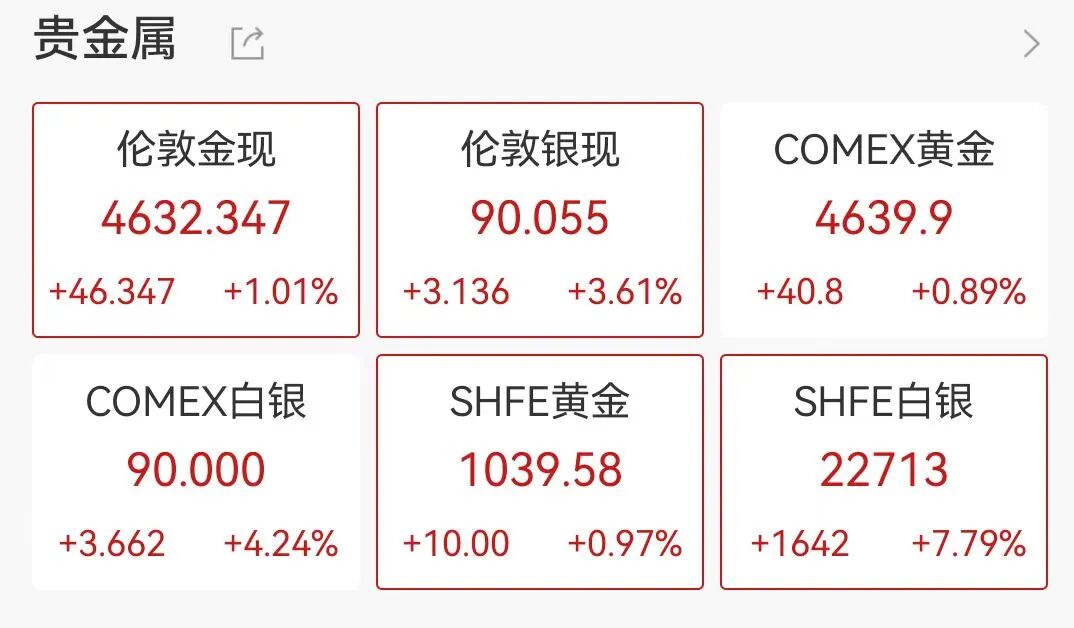 贵金属集体走强,截至发稿,现货黄金冲破4630美元/盎司关口,涨幅超1%,澳新银行预计,2026年下半年黄金交易价格将高于5000美元/盎司。现货白银站稳90美元大关,涨幅3.61%,沪银涨幅逼近8%,铜、锌、锡集体上涨。