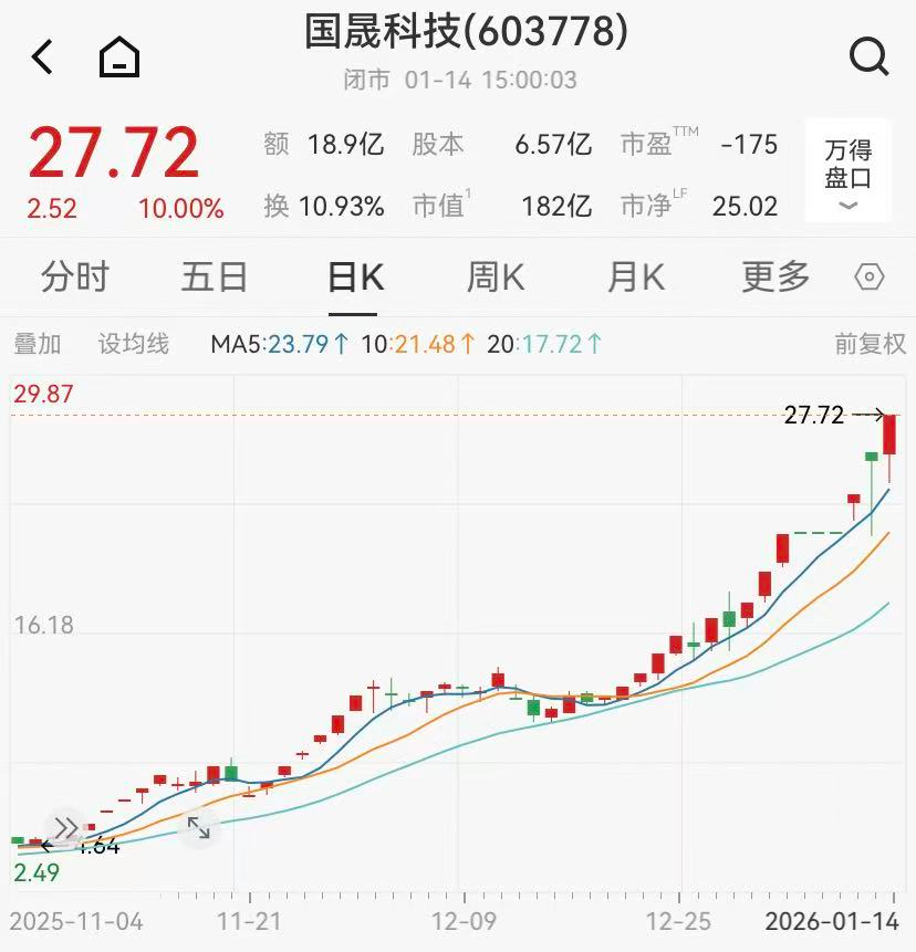 同日晚间,国晟科技发布的股价异常波动公告显示,2025年10月31日至2026年1月14日期间,公司股票6次触及股价异常波动、1次触及严重异常波动情形,期间累计涨幅高达511.92%,公司股价累计涨幅偏离基本面,存在市场情绪过热、非理性炒作风险,存在股价短期快速回落风险。