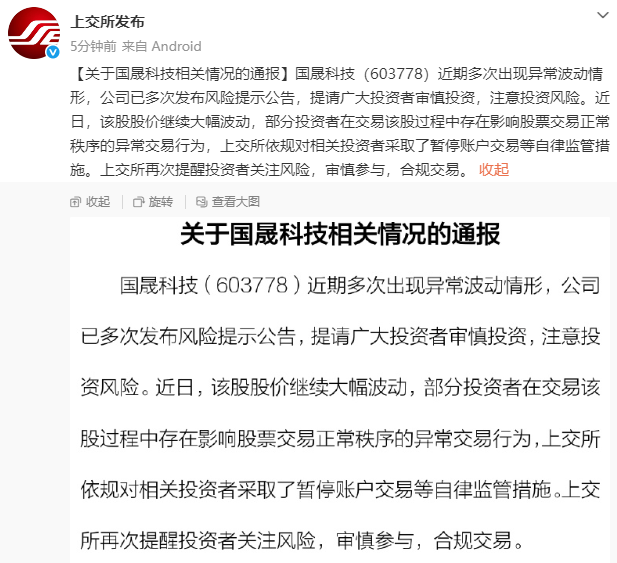 1月14日晚,上交所发布《关于国晟科技相关情况的通报》称,近日,国晟科技股价继续大幅波动,部分投资者在交易该股过程中存在影响股票交易正常秩序的异常交易行为,上交所依规对相关投资者采取了暂停账户交易等自律监管措施。