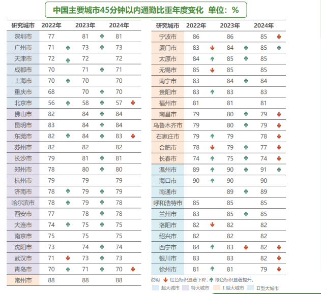 《报告》数据显示,2024年中国主要城市45分钟以内通勤比重平均为77%,其中超大城市平均为71%,深圳这一比重达到81%,与佛山、昆明并列超大、特大城市最高水平。