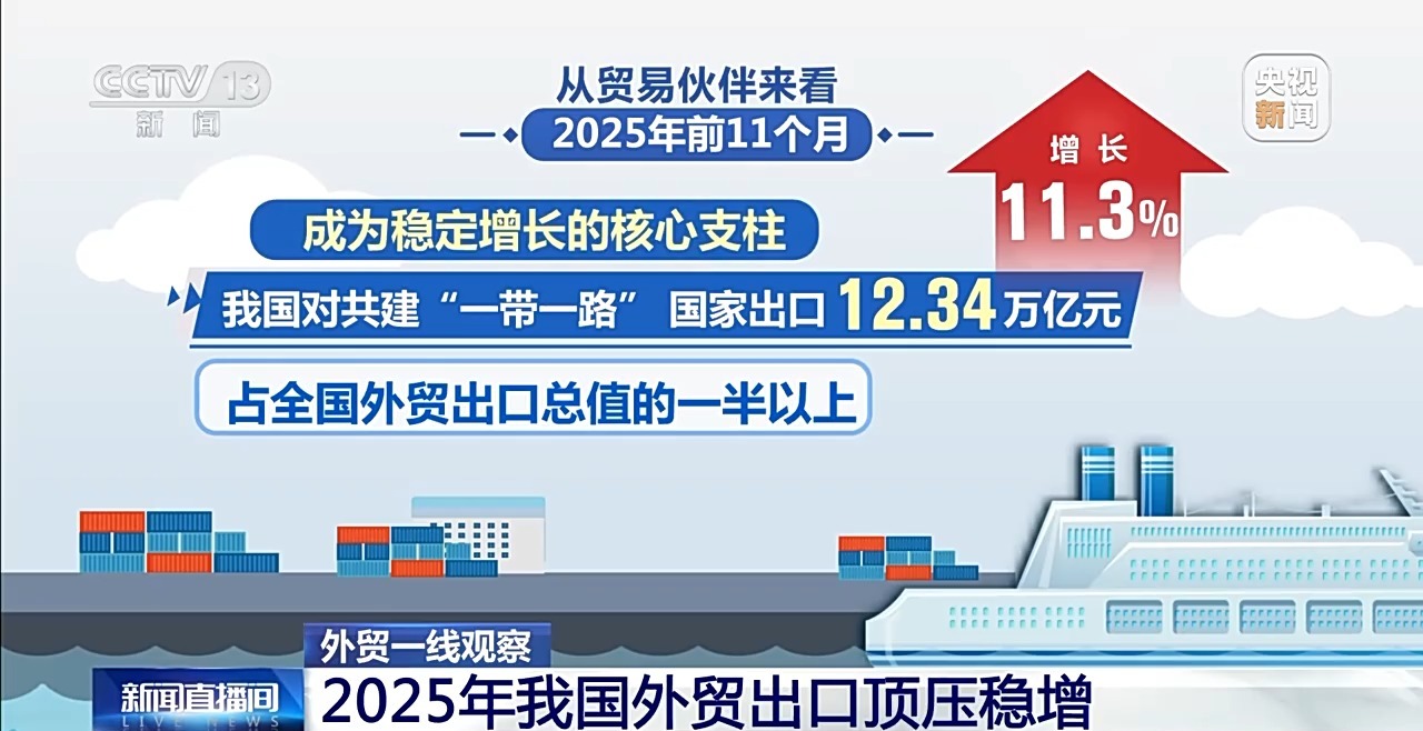 从贸易伙伴来看,2025年前11个月,东盟为我国第一大贸易伙伴,对东盟出口4.29万亿元,增长14.6%。欧盟为我国第二大市场,对欧盟出口3.64万亿元,增长8.9%。我国对共建“一带一路”国家出口12.34万亿元,增长11.3%,占全国外贸出口总值的一半以上,成为稳定增长的核心支柱。