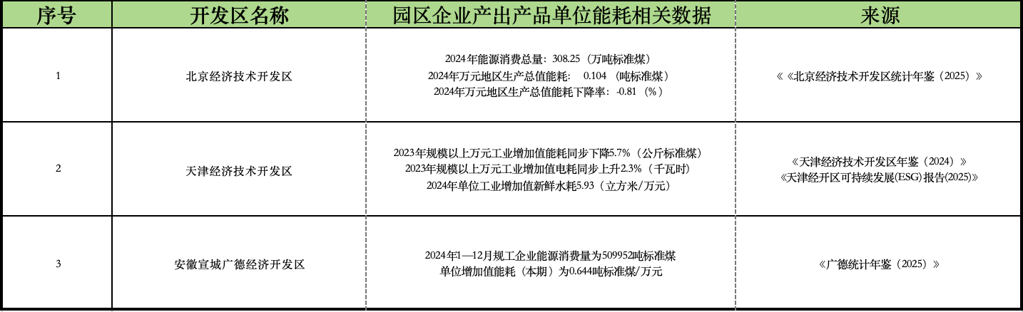 在“园区企业产出产品单位能耗”这一指标方面,我们尚未在15个抽样园区的公开资料中查询到相关数据。因此,我们统计了园区相关单位能耗指标,但是公开数据依然屈指可数,且数据质量参差不齐。我们发现各园区公开的单位能耗指标不尽相同,例如北京经济技术开发区公布了其“万元地区生产总值能耗”数据,而天津经济技术开发区公布了其“万元工业增加值电耗”数据,安徽宣城广德经济开发区公布了“规工企业单位增加值能耗”数据。