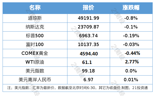 1、美股三大指数集体收跌,道指跌0.80%,纳指跌0.1%,标普500指数跌0.19%。科技股涨跌互现,英特尔涨超7%并创近两年新高。热门中概股多数下跌,纳斯达克中国金龙指数跌1.86%。