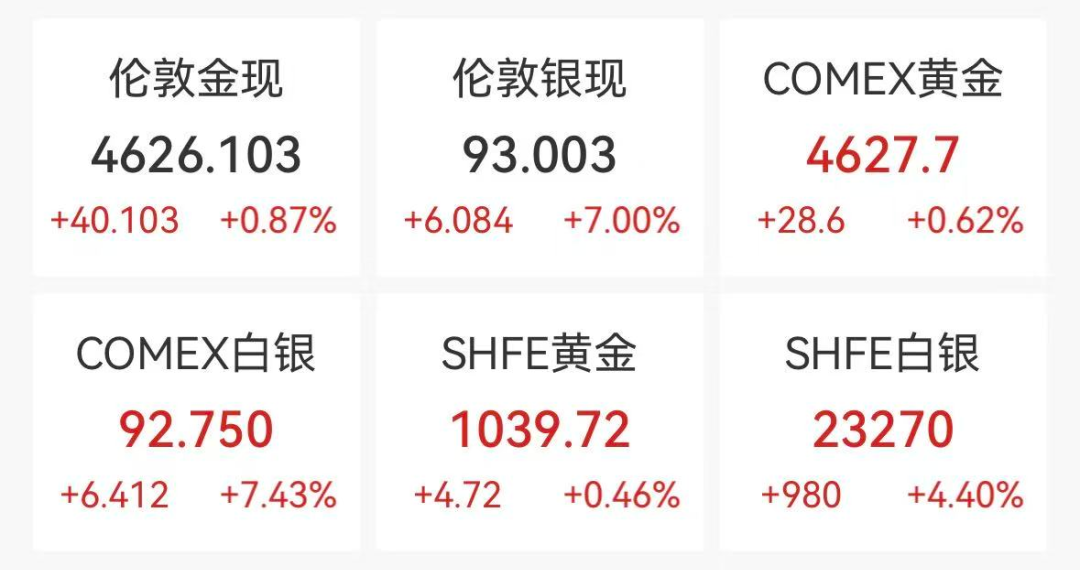 白银再创新高。现货黄金尾盘涨0.87%,报4626.1美元/盎司,COMEX黄金期货涨0.62%,报4627.7美元/盎司;现货白银突破93美元/盎司,日内涨7%。COMEX白银期货涨超7%,报92.7美元/盎司。