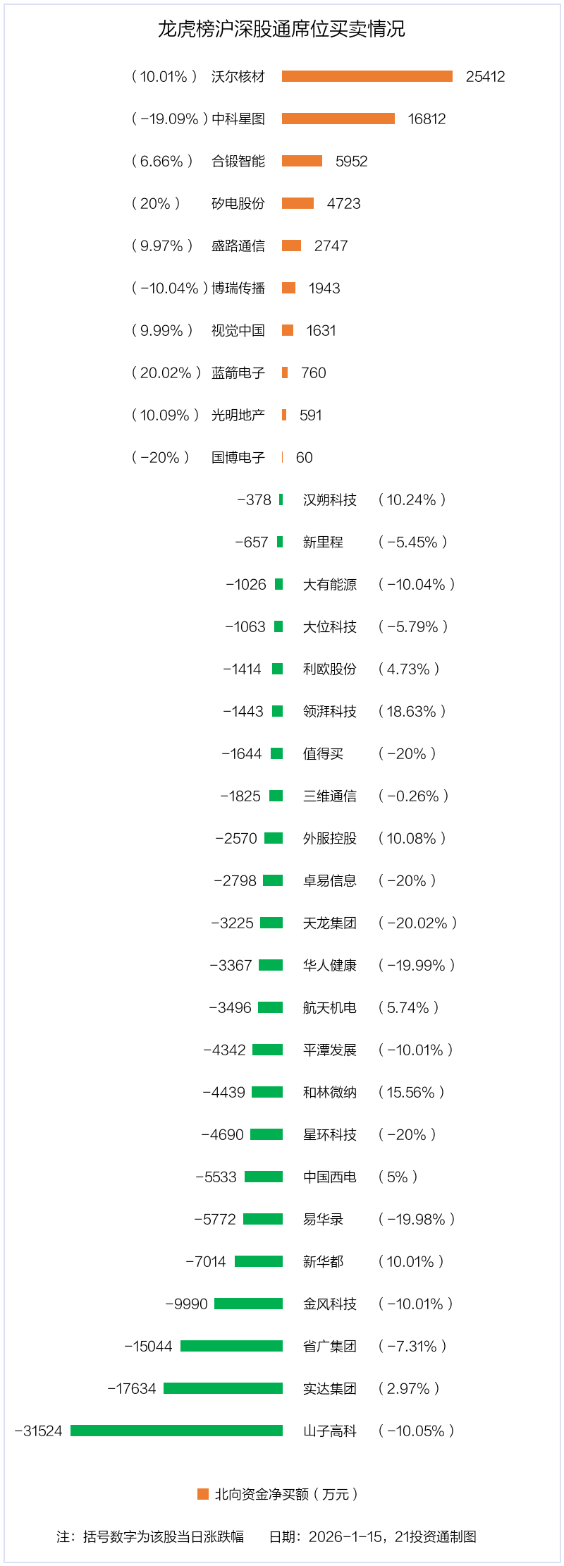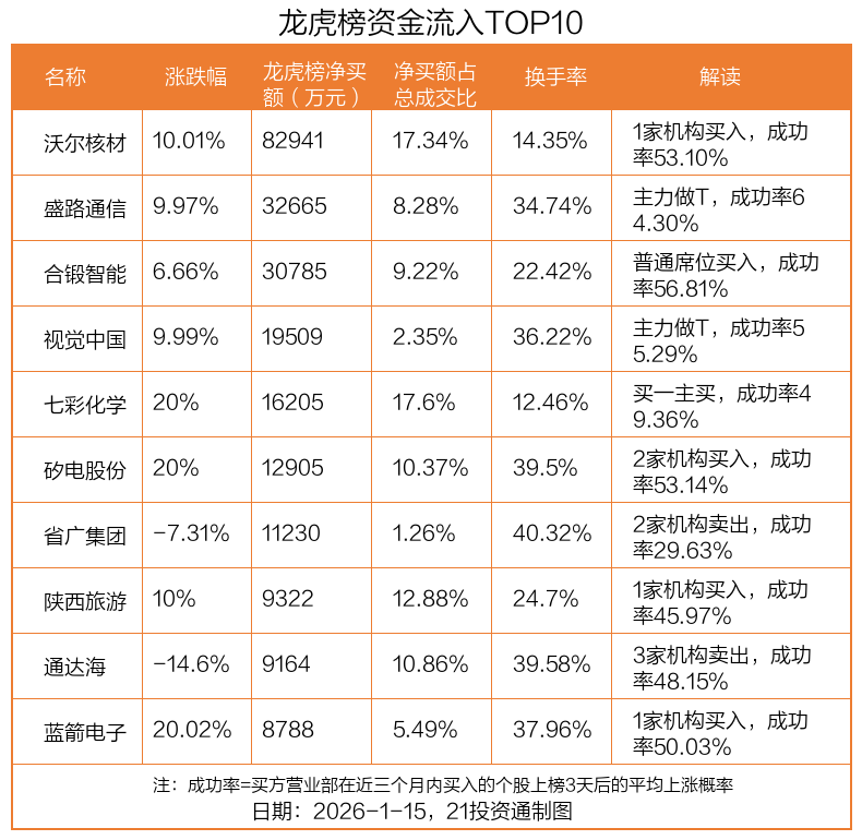 1月15日,上证指数下跌0.33%,深证成指上涨0.41%,创业板指上涨0.56%。盘后龙虎榜数据显示,共有65只个股因当日异动登上龙虎榜,资金净流入最多的是沃尔核材(002130.SZ),达8.29亿元。