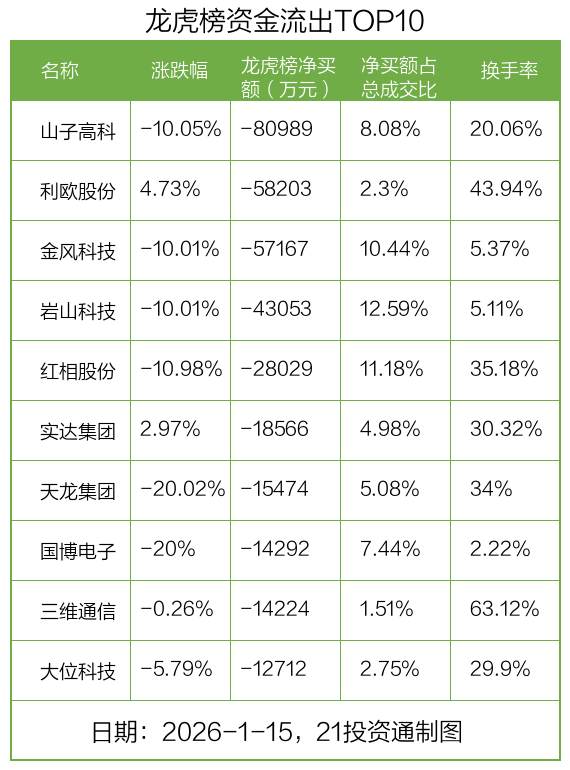 而龙虎榜中资金净流出最多的是山子高科(000981.SZ),被净卖出为8.1亿元,占总成交金额的8.08%。山子高科收盘下跌10.05%,换手率为20.06%。