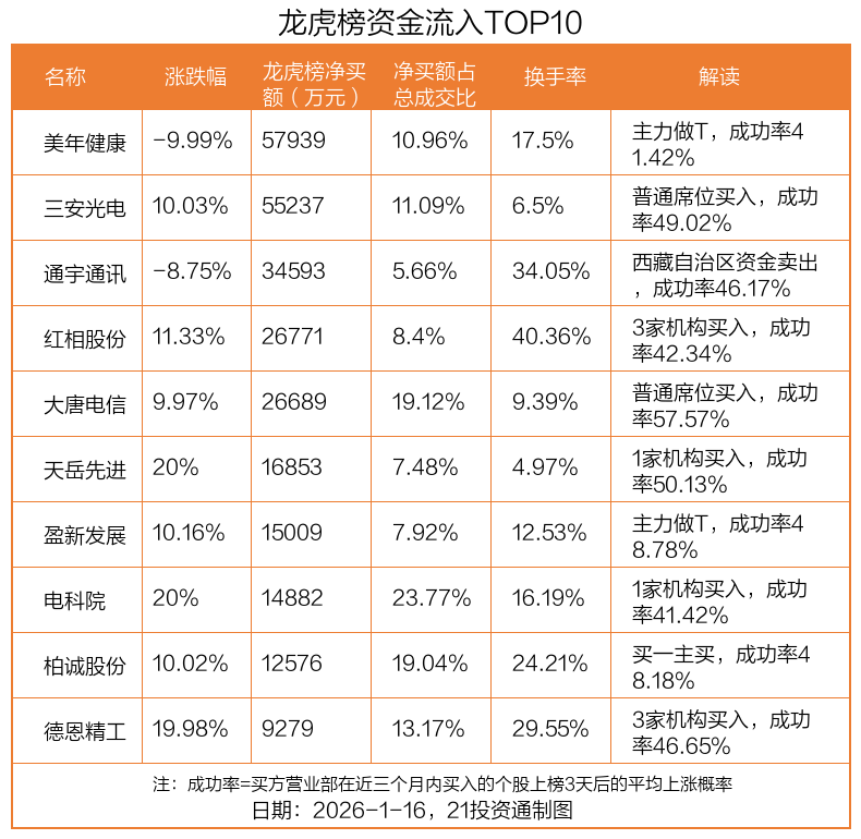 1月16日,上证指数下跌0.26%,深证成指下跌0.18%,创业板指下跌0.2%。盘后龙虎榜数据显示,共有63只个股因当日异动登上龙虎榜,资金净流入最多的是美年健康(002044.SZ),达5.79亿元。