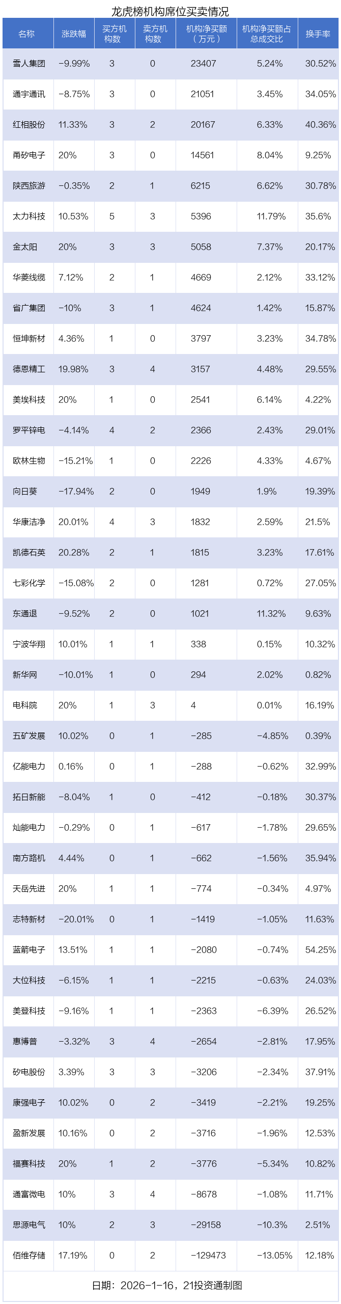 1月16日,40只个股龙虎榜出现了机构的身影,机构合计净卖出6.74亿元。具体来看,机构净买入22股,净卖出18股。