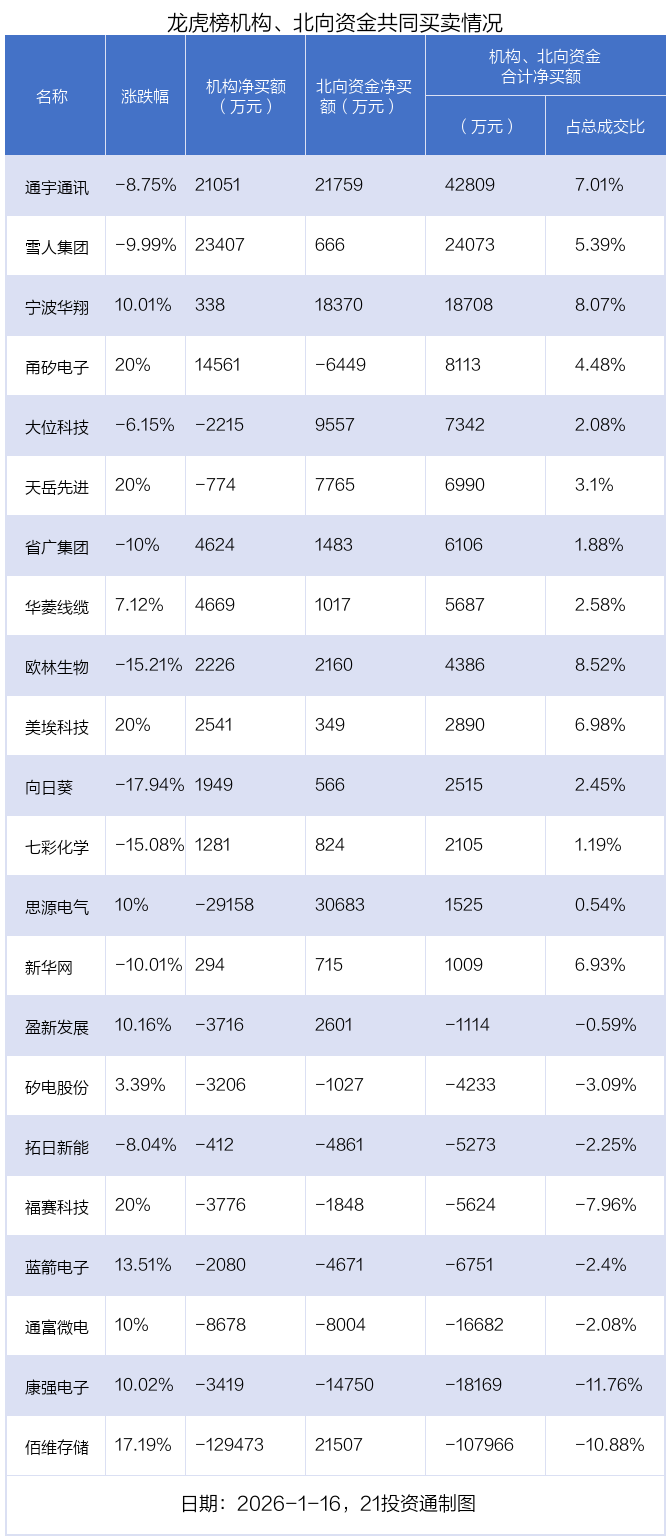 值得注意的是,机构和北向资金共同净买入了通宇通讯、宁波华翔、欧林生物、省广集团、华菱线缆、七彩化学、新华网、雪人集团、向日葵、美埃科技等10股;共同净卖出了矽电股份、福赛科技、蓝箭电子、拓日新能、通富微电、康强电子等6股;在思源电气、佰维存储、大位科技、天岳先进、盈新发展、甬矽电子上出现分歧,机构净卖出思源电气2.92亿元,北向资金净买入3.07亿元;机构净卖出佰维存储12.95亿元,北向资金净买入2.15亿元;机构净卖出大位科技2215.34万元,北向资金净买入9556.89万元;机构净卖出天岳先进774.31万元,北向资金净买入7764.65万元;机构净卖出盈新发展3715.56万元,北向资金净买入2601.08万元;机构净买入甬矽电子1.46亿元,北向资金净卖出6448.59万元。