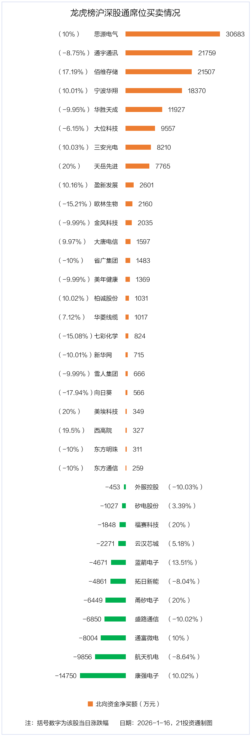 1月16日,北向资金参与龙虎榜中的个股共有35只,合计净买入8.6亿元。其中沪股通净买入13股,净卖出3股,合计净买入4.9亿元;深股通净买入11股,净卖出8股,合计净买入3.71亿元。