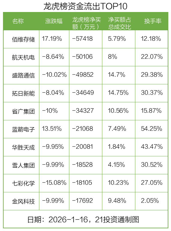 而龙虎榜中资金净流出最多的是佰维存储(688525.SH),被净卖出为5.74亿元,占总成交金额的5.79%。佰维存储收盘上涨17.19%,换手率为12.18%。