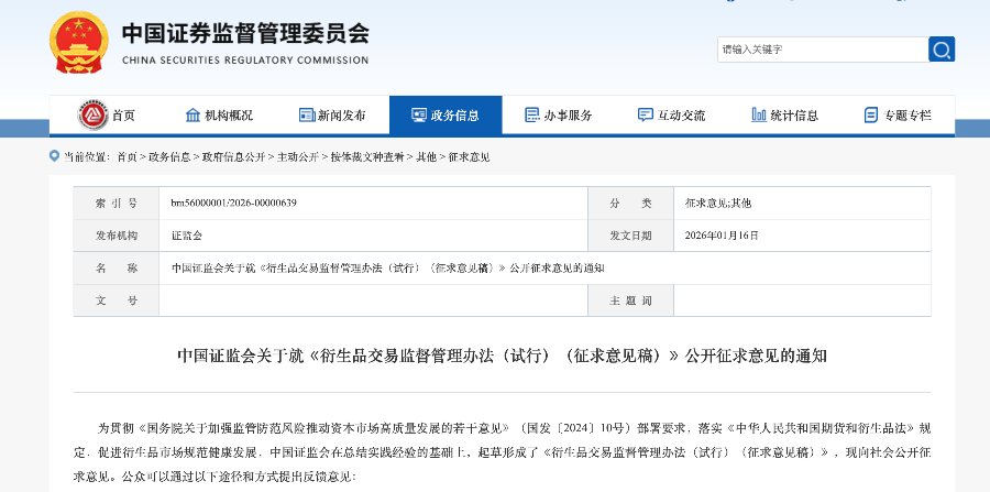 1月16日,中国证监会就《衍生品交易监督管理办法(试行)(征求意见稿)》面向社会公开征求意见。