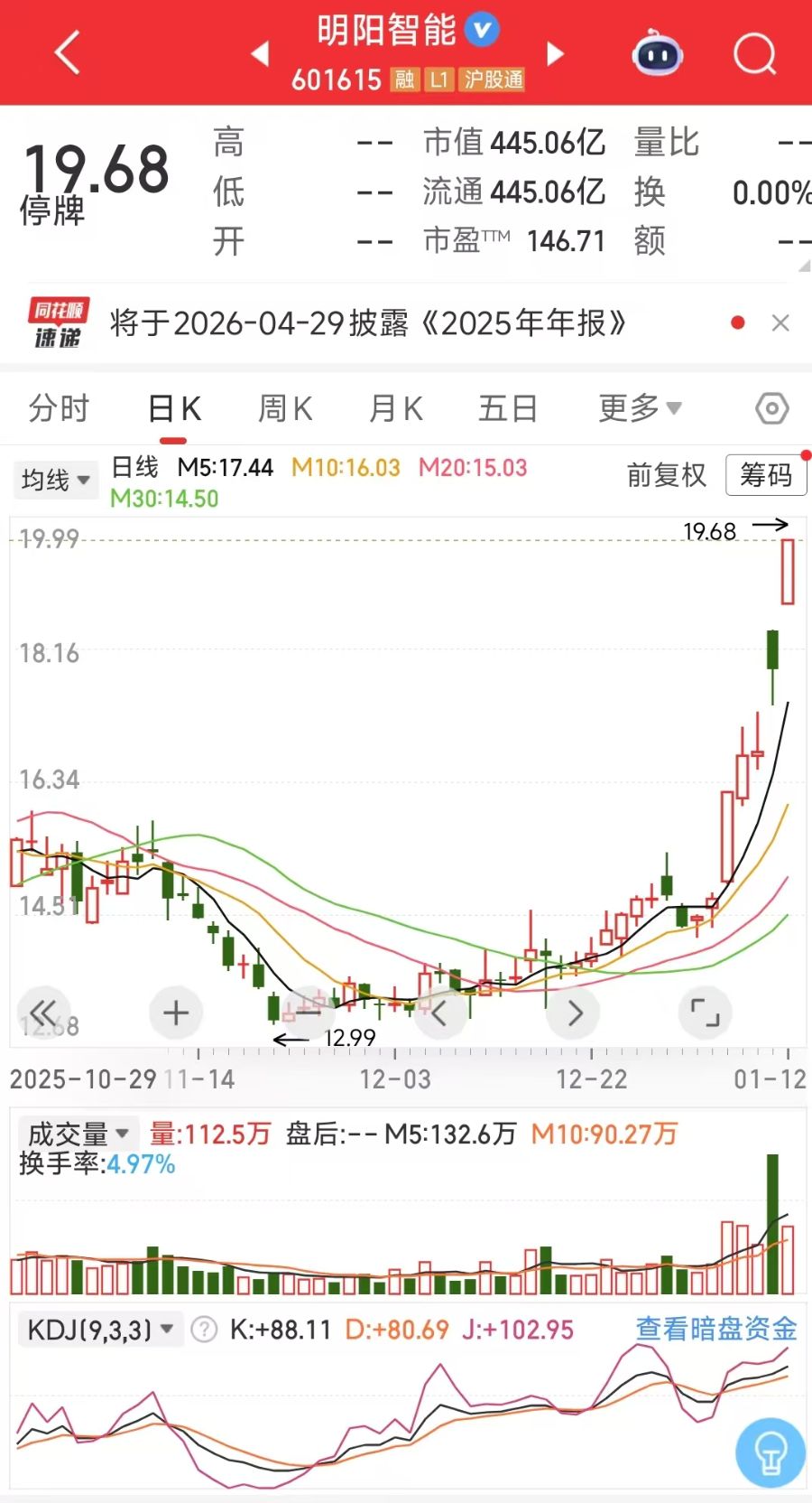 值得注意的是,早在2025年12月30日就有投资者在上证e互动平台了解德华芯片同明阳智能的关系,明阳智能股价在公告发布前也已出现异动。1月12日,公司以涨停收盘,收于19.68元/股,总市值约445亿元。2026年以来,明阳智能股价累计涨幅近40%。