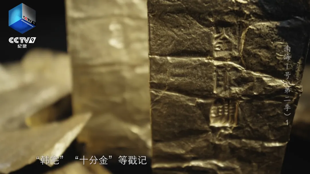这是在船上发现的金叶子,用纯金制成,正面还砸印有“韩四郎”“刘郎铺”等戳记。