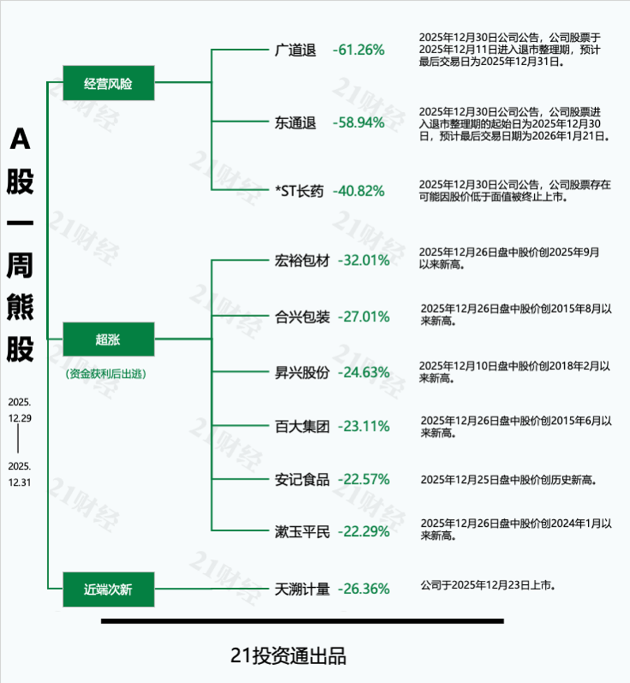 此外,熊股榜第二名东通退公告称,公司股票已被深圳证券交易所决定终止上市交易,将于2025年12月30日起进入退市整理期交易。公告显示,公司股票进入退市整理期的起始日为2025年12月30日,退市整理期为15个交易日,预计最后交易日期为2026年1月21日。