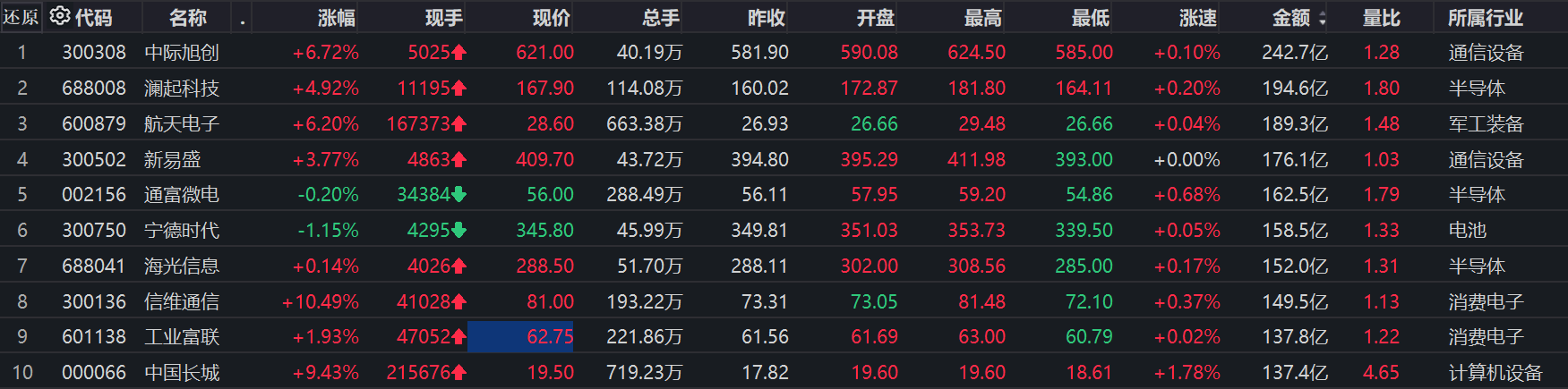 个股方面,中际旭创成交额破200亿元,达242.7亿元,澜起科技、航天电子、新易盛等成交额靠前。