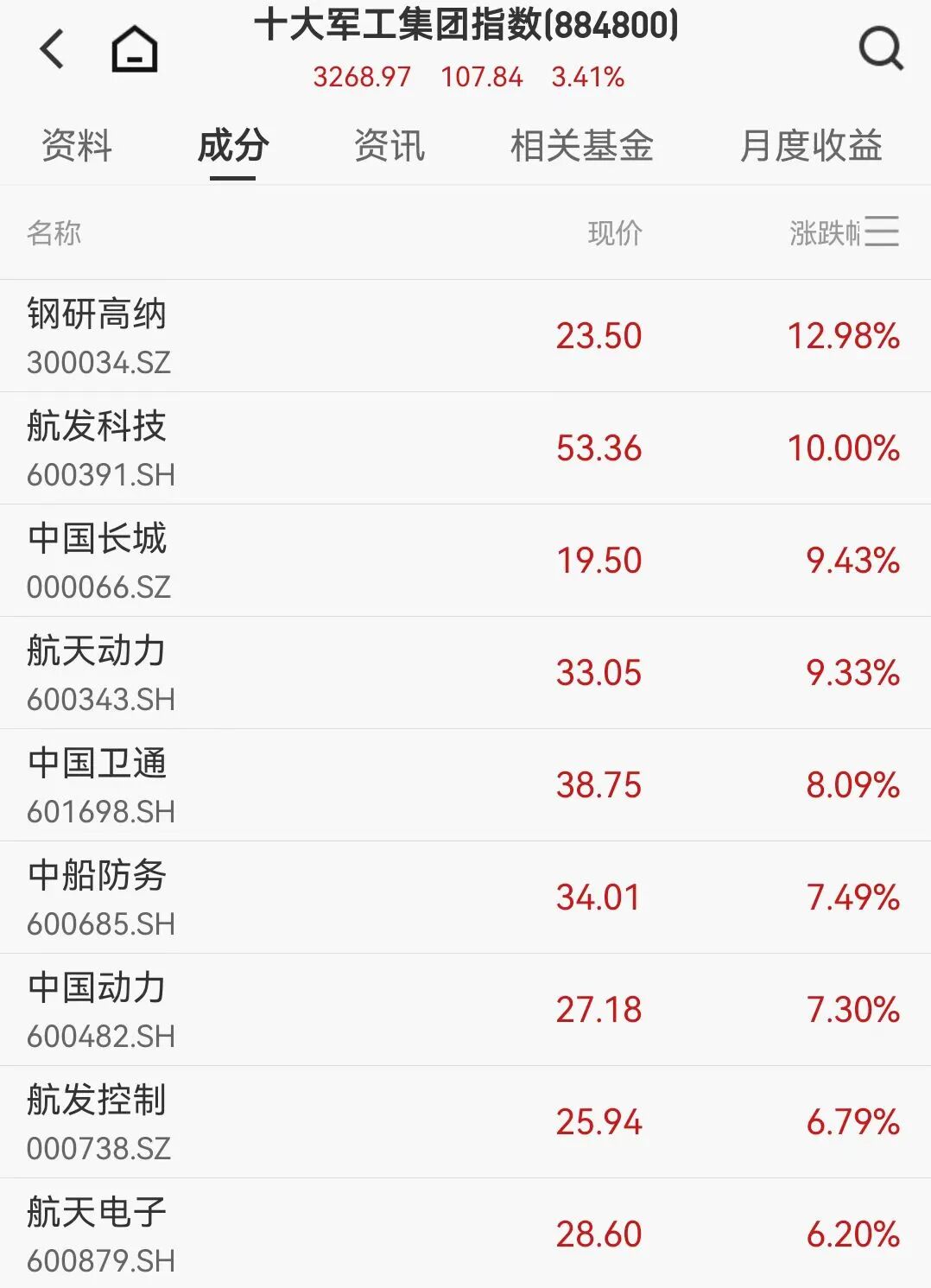 1月22日午后,航天科技集团板块走强,三角防务20cm涨停,航发科技、北摩高科涨停,航天动力、航天电子等多股走高。千亿龙头中国卫通尾盘拉升超8%。