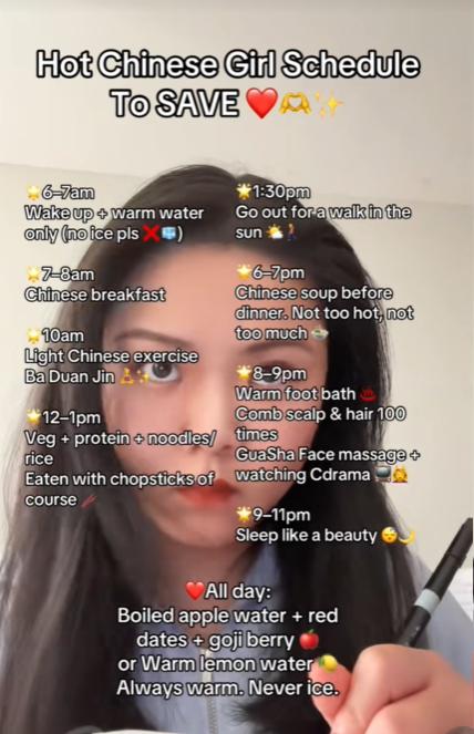 还有人列出了更详细的版本,在《八方来财》的背景音乐里,还原中式生活的一天,方便大家抄作业,包括但不限于早起喝热水(加枸杞)、自己做温热的早餐、打八段锦、晒太阳散步、泡脚……