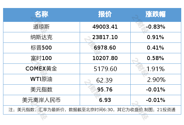 纽约股市三大股指1月27日涨跌不一。截至当天收盘,道琼斯工业平均指数比前一交易日下跌408.99点,收于49003.41点,跌幅为0.83%;标准普尔500种股票指数上涨28.37点,收于6978.60点,涨幅为0.41%;纳斯达克综合指数上涨215.74点,收于23817.10点,涨幅为0.91%。