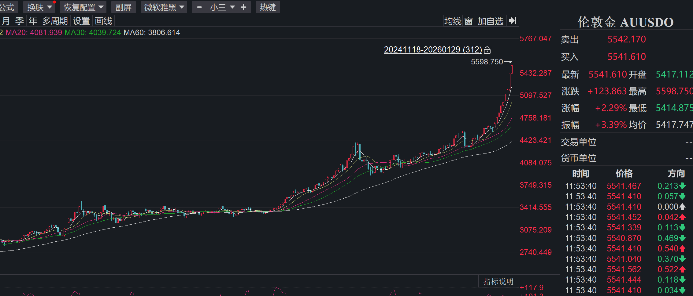 21世纪经济报道记者 叶麦穗 黄金杀疯了!由于地缘冲突有进一步加剧的风险,1月29日,黄金亚洲时间开盘不久就开始狂飙,盘中最高触及5598.75美元/盎司(截至北京时间12点,下同),今年以来的涨幅已经逼近30%,此前多数机构机构认为2026年,黄金的涨幅在15%到30%之间,结果不到一个月的时间,黄金已经要完成任务。