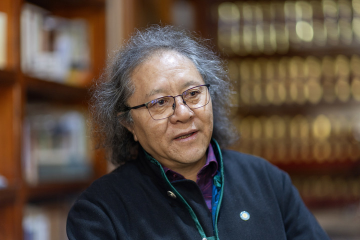 藏族音乐家觉嘎在家中与客人谈论音乐理念(2025年11月4日摄)。新华社记者 姜帆 摄