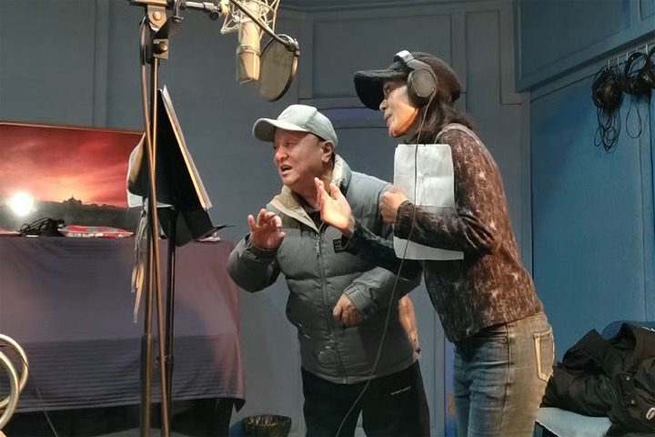 美朗多吉(左)在录音室中指导歌手演唱(视频截图)。新华社发