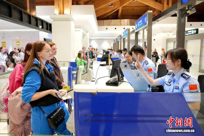 2026年1月1日凌晨,来自俄罗斯符拉迪沃斯托克的SU856次航班搭载155名旅客平稳降落三亚凤凰国际机场。图为游客正在办理入境手续。 王程龙 摄