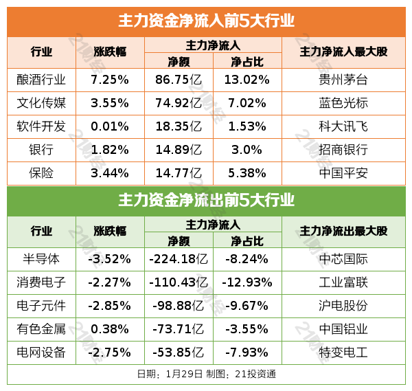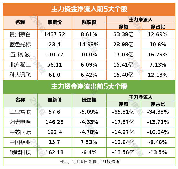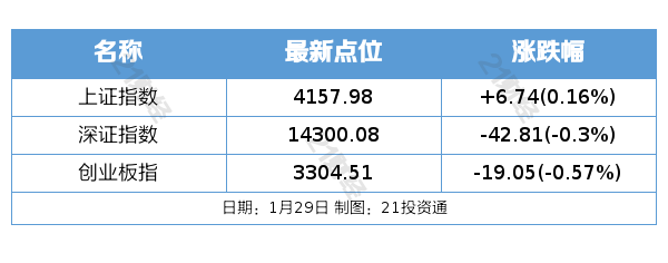 1月29日,三大指数涨跌不一,沪指窄幅震荡,上证50指数涨超1%,创业板指冲高回落,科创50指数跌超3%。截至收盘,沪指涨0.16%,深成指跌0.3%,创业板指跌0.57%。沪深两市成交额3.23万亿,较上一个交易日放量2646亿。