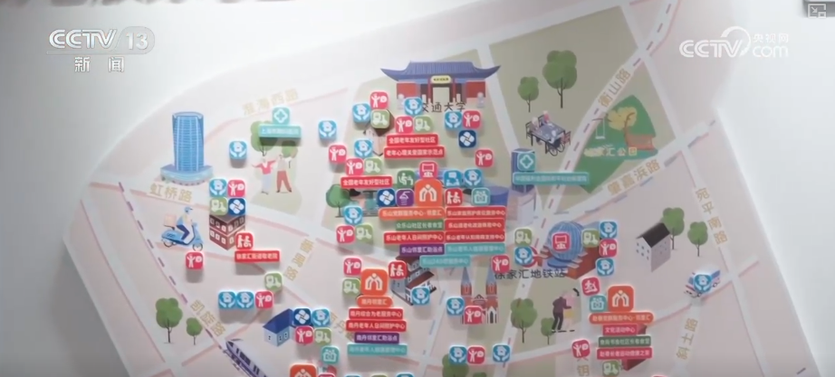 家里有一键呼救的“生命线”,小区有老人友好的“导航线”,步行不到15分钟,街道里还有提供各种养老服务的“生活盒子”,也就是建在社区中的一站式综合服务空间。在徐家汇街道的“生活盒子”,记者看到一张这样的养老服务中心地图,老人可以早上去社区食堂吃饭,中午参加手工活动,下午去看电影,享受“一站式”便利。