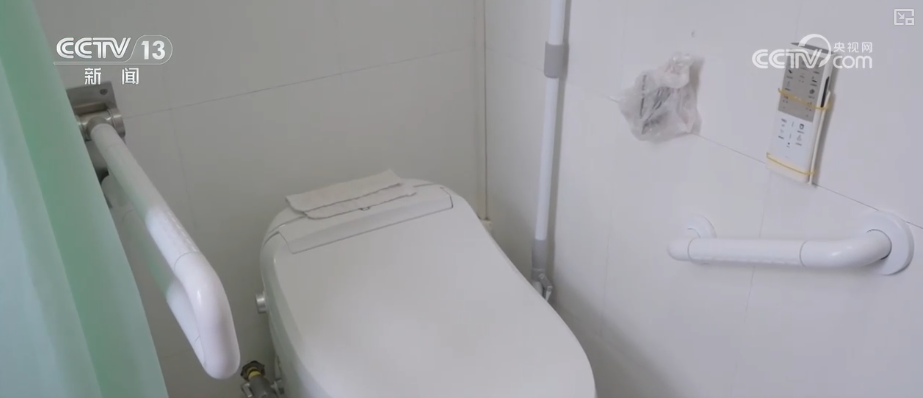 适老化改造设计师魏玲介绍,在每一个空间场景中都为老人设置了一些安全扶手,在马桶旁区域安装了一个可以上翻的扶手,不使用的时候可以翻上去,这样也不会影响到通行。