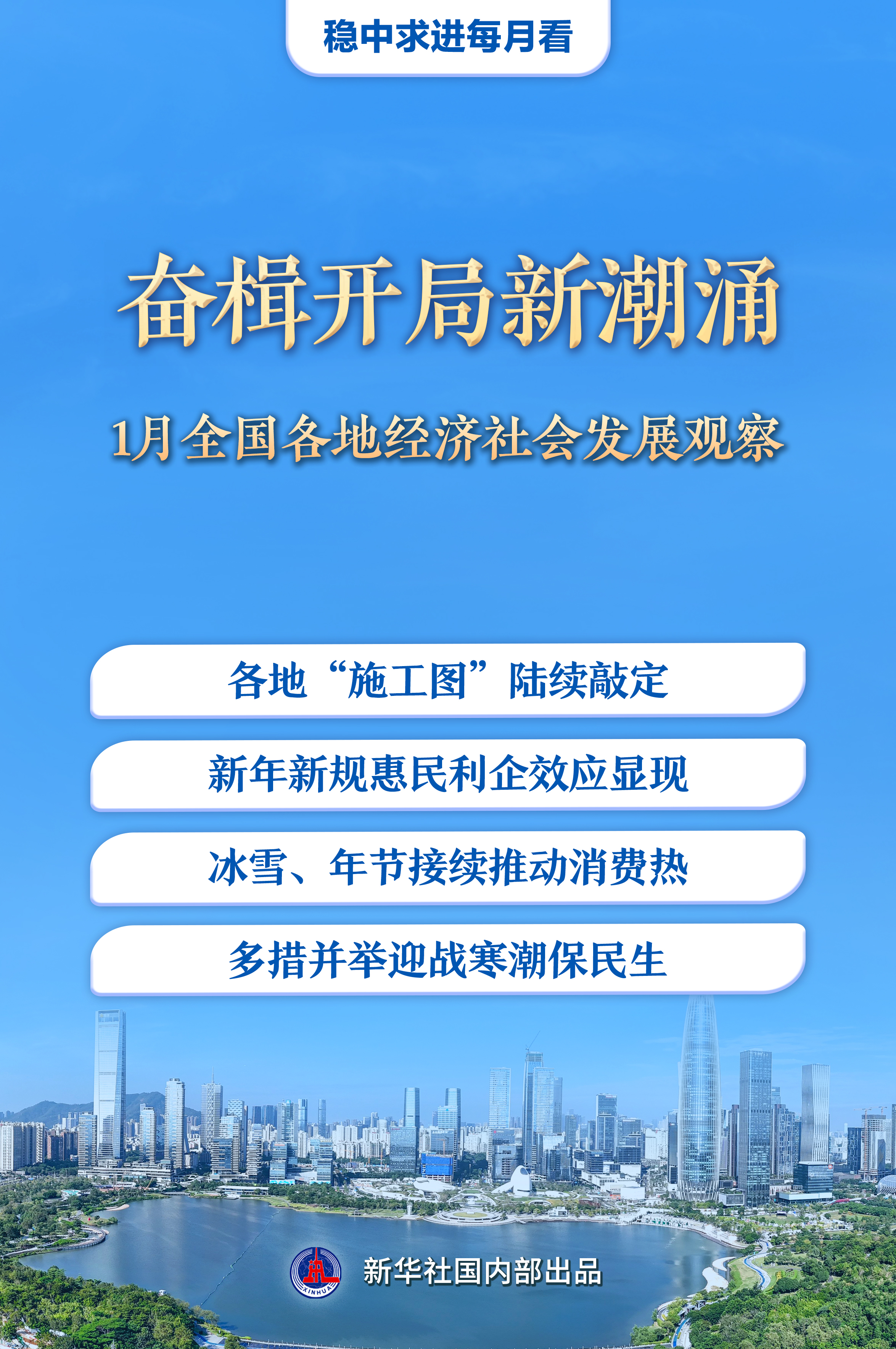 地方两会陆续召开,布局全年发展重点;惠民利企新规相继落地,政策效应不断显现;冰雪经济、年节经济冬日接力,为消费增添新动能;新技术、新方法筑牢温暖防线,迎战寒潮……1月以来,我国经济社会发展亮点多、新意足,在保持稳中有进态势下,全国各地奋楫开局,经济社会发展信心和动力不断增强。