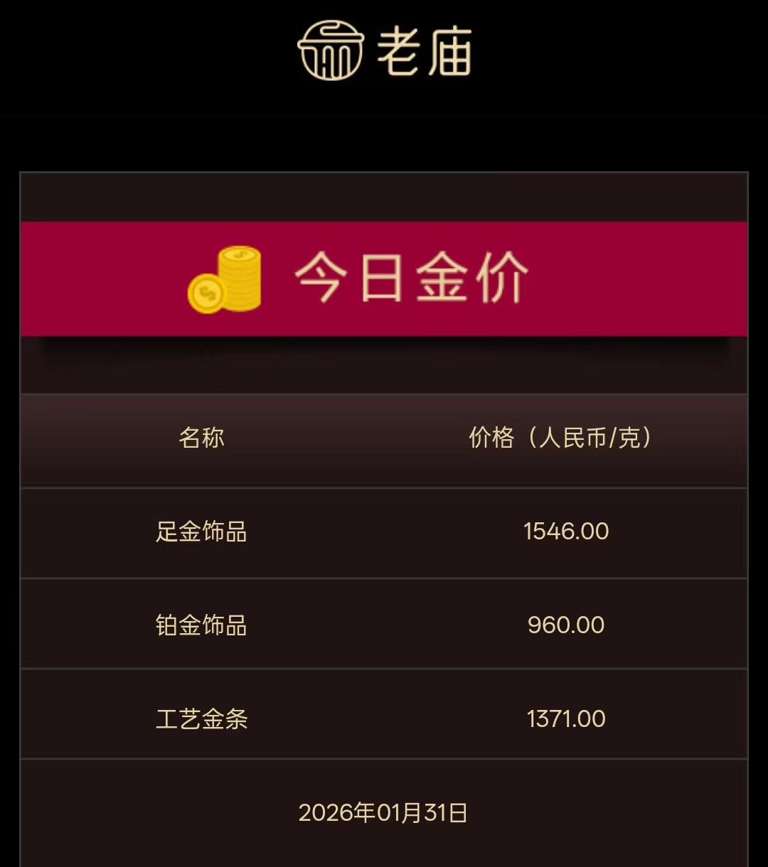 - 老庙黄金足金饰品报1546元/克,较前一日跌144元;