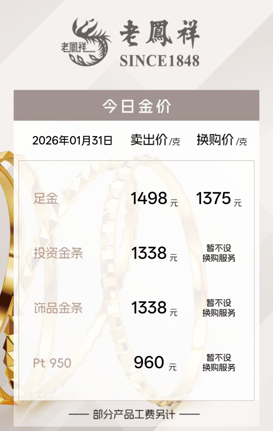 - 老凤祥足金饰品报1498元/克,较前一日跌170元;